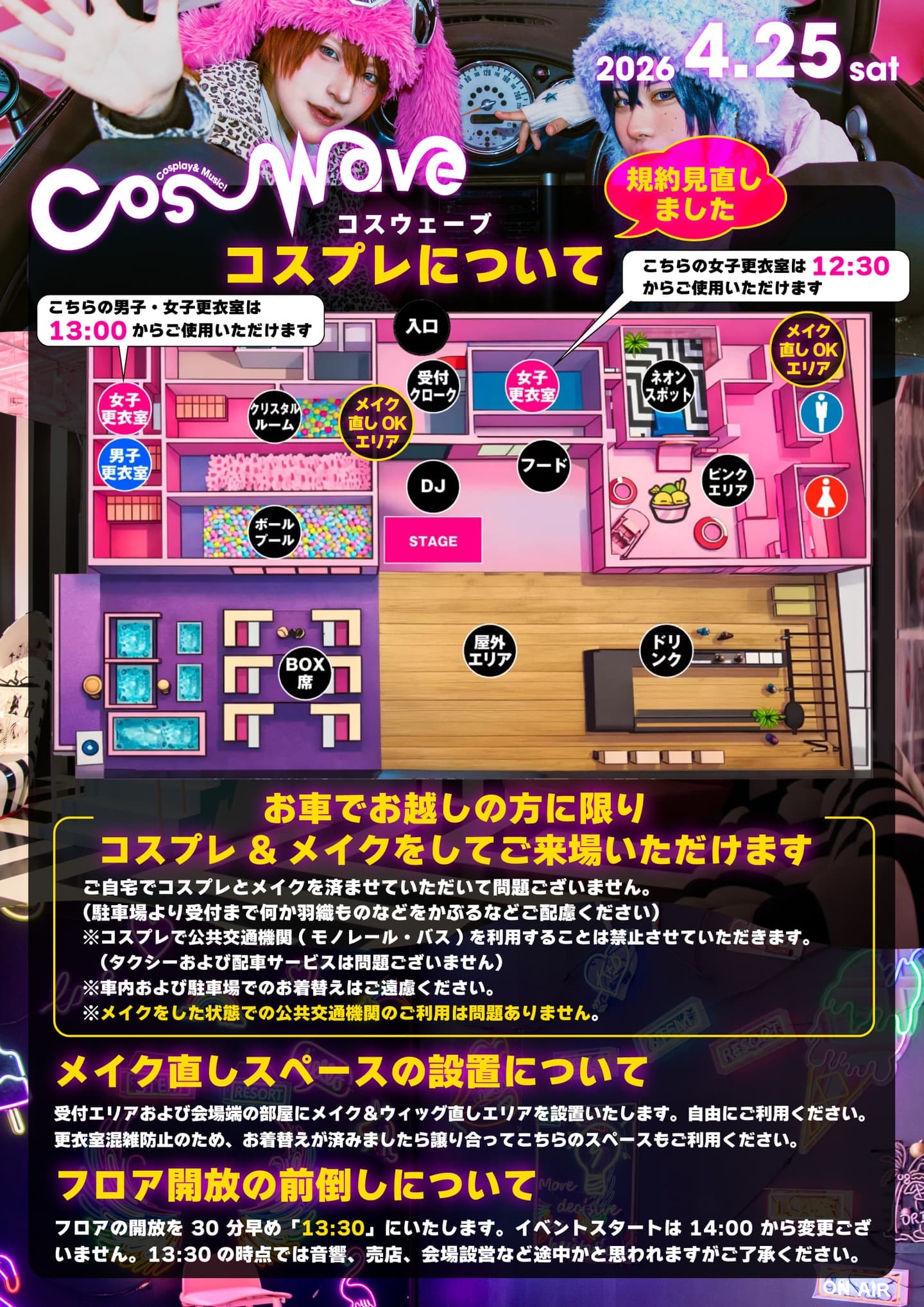 ・トイレや近隣店舗での着替え、衣装直し、メイク直しは禁止です。会場内の更衣室にて行なってください。
